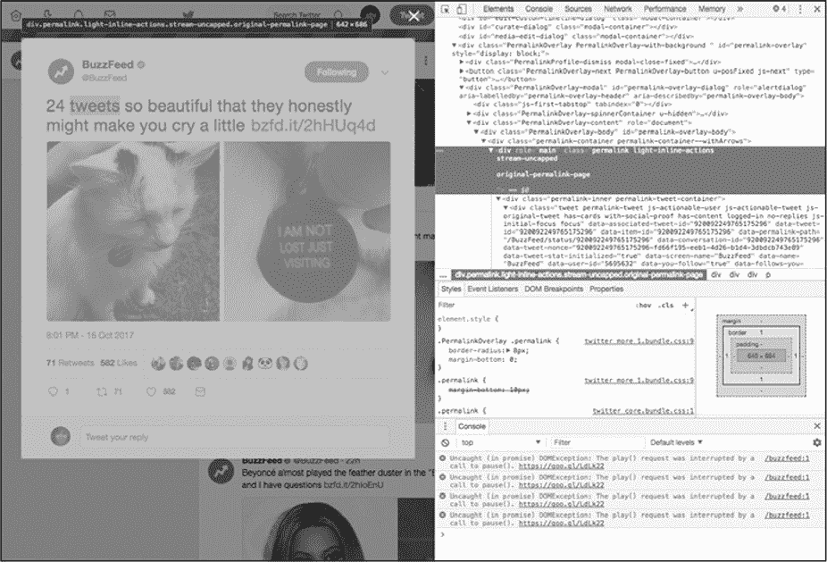 现在您可以看到该推文由嵌套在\<div>标记中的一堆代码组成,该标记已被分配为类 permalink- container。请注意,该代码是由标记和类组成的,例如到目前为止,我们已经介绍了简单的 HTML 示例。尽管实际的网站数据看起来很复杂,但是信息却像嵌入在更简单的 HTML 代码中一样被嵌入到标记中。