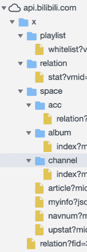 从图 F1-2 中可以看到:api.bilibili.com 中包含一个文件夹 x,内容全部在 x 文件夹中,其中包含了 playlist、relation 以及 space 三个主要的文件夹。space 文件夹中还包含了 acc、album 和 channel 文件夹。