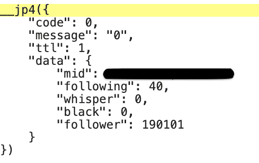 从这些含义的字面上可以得出一些基本的判断:relation 以及 acc 两文件夹中包含的信息不是想要的。逐个代开其他 4 个文件夹的内容后发现,以下 API 链接返回了我们想要的关于该播主的统计信息(图 F1-3 展示了在 Chrome 的 Web Inspector 中显示的 API 内容):