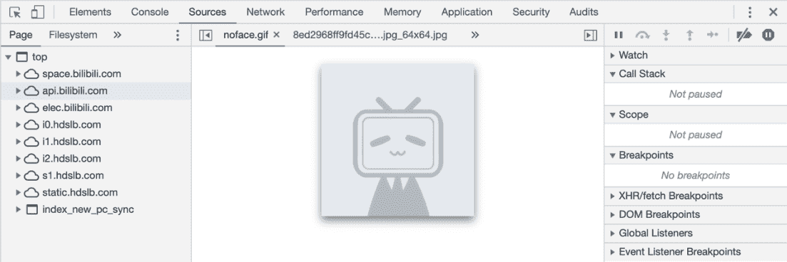 用 Chrome 打开哔哩哔哩某个播主的主页,然后点击按键 F12 开启 Chrome 的 Web Inspector。在弹出的 Web Inspector 窗口中点击Sources进入该页面的源码视图(图 F1-1)。