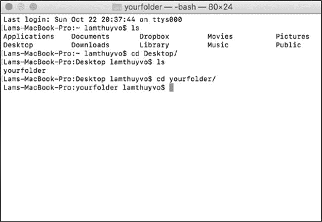 通过命令行接口切换至一个文件夹,可以使用 cd 命令(代表 change directory),然后是文件夹的路径。例如,如果文件夹存储在 Mac 上的 Documents 文件夹中,请运行以下命令: