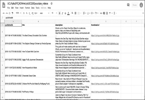 保存此脚本,然后按照第 46 页中"运行脚本"的方式运行。完成运行脚本后,应该在与脚本相同的文件夹中找到一个名为 youtube_videos.csv 文件。在表格程序中打开该文件时,表格程序应该显示类似于图 3-2 的 YouTube 视频数据。